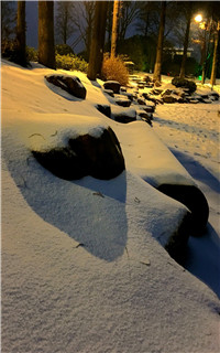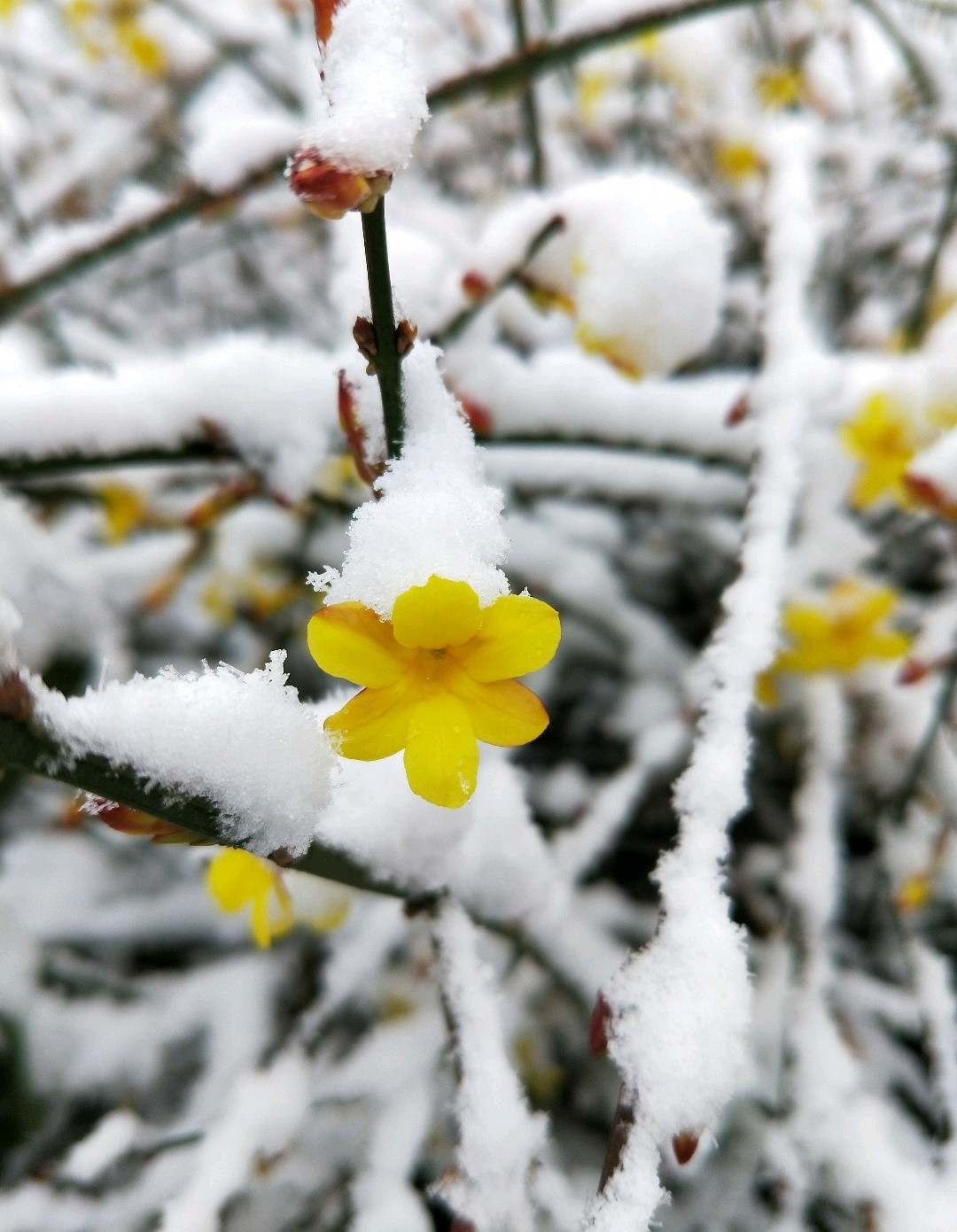 迎春花开放在2017年的第一场大雪。用手机拍摄。
